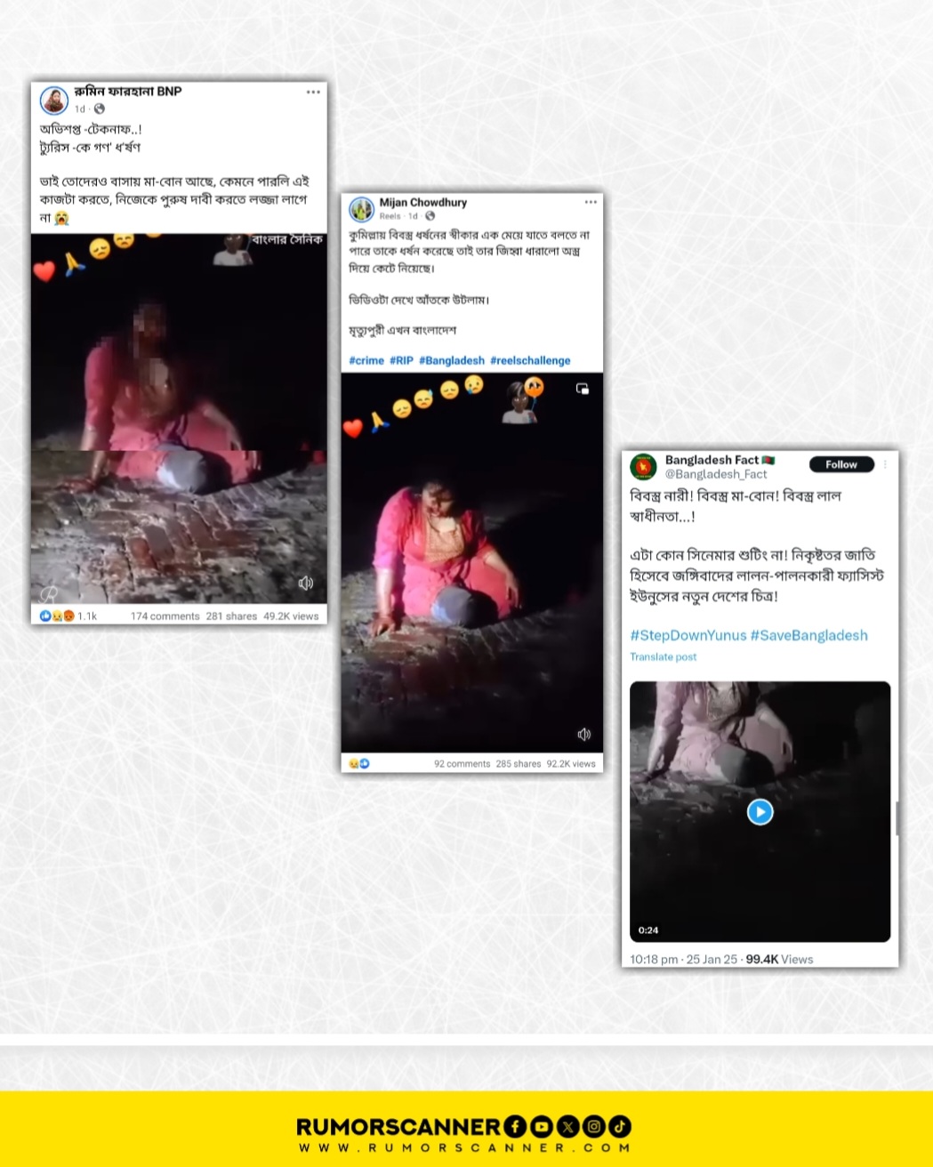 রিউমর স্ক্যানার টিমের অনুসন্ধানে জানা যায়, রাস্তার ধারে ক্ষতবিক্ষত নারীর ভাইরাল ভিডিওটি বাংলাদেশের কোনো ঘটনার নয় বরং, ভারতের পশ্চিমবঙ্গের একটি সাম্প্রতিক ঘটনার ভিডিওকে বাংলাদেশের দাবিতে প্রচার করা হচ্ছে৷