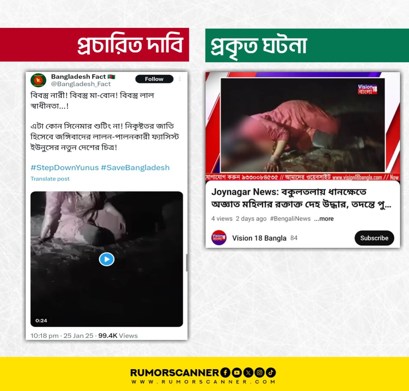 অধিকতর অনুন্ধানে ‘Vision 18 Bangla’ নামক ইউটিউব চ্যানেলে গত ২৪ জানুয়ারি প্রকাশিত ‘Joynagar News: বকুলতলায় ধানক্ষেতে অজ্ঞাত মহিলার রক্তাক্ত দেহ উদ্ধার, তদন্তে পুলিশ।’ শিরোনামে একটি ভিডিও খুঁজে পাওয়া যায়। উক্ত ভিডিওর সাথে আলোচিত ভিডিওটির বিষয় ও পারিপার্শ্বিকতার মিল রয়েছে৷